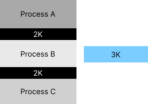 요청한 메모리 크기 3K는 메인 메모리 내에 빈 공간의 총합(4K)으로만 따진다면 적재할 수 있지만,
