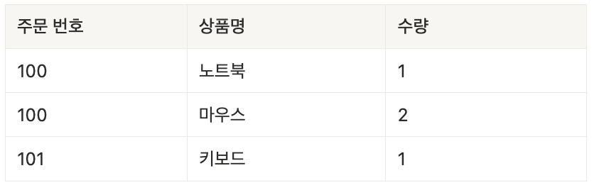 주문 번호 100번인 행은 상품명과 수량 컬럼의 값을 2개씩 가지고 있기 때문에, 제 1 정규화를 진행할 수 있다.