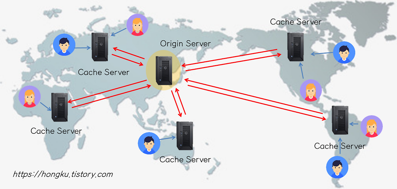 CDN(Content Delivery Network)은 웹 콘텐츠를 전 세계 서버에 분산하여 저장하는 네트워크로,
