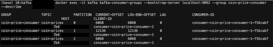 먼저 어떤 컨슈머가 어떤 파티션을 차지하는지에 대해 명령어를 통해 확인해보도록 하겠다.